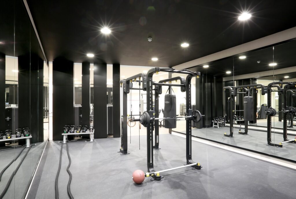 Clear zoning enhances usability. Cardio equipment typically anchors one side of the space, strength training occupies a central or structured zone, and functional or stretching areas are positioned where ceiling height and clearance allow dynamic movement. This organisation reduces uncertainty and improves user flow.